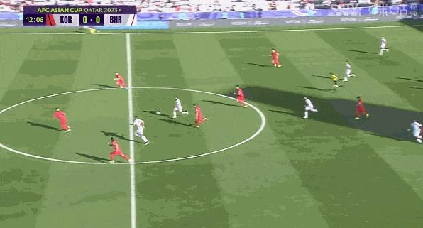 韓國隊上半場果然遭遇巴林隊頑強抵抗,不到半小時就因犯規喫到3張黃牌。上半場的僵持中韓國隊製造了一些威脅,第30分鐘李在成左路傳中,曹圭成門前錯失良機。不過巴林隊反擊也很犀利,馬丹隨後接高中鋒哈什薩什穿透防線直傳,也錯失單刀球。第38分鐘韓國隊打破僵局:金玟哉後場墜球快發直傳前場,李在成左邊路橫傳禁區。中路孫興慜讓給右路後插上的黃仁範,後者射出弧線球打破僵局,這是韓國隊首次射門中靶就進球。