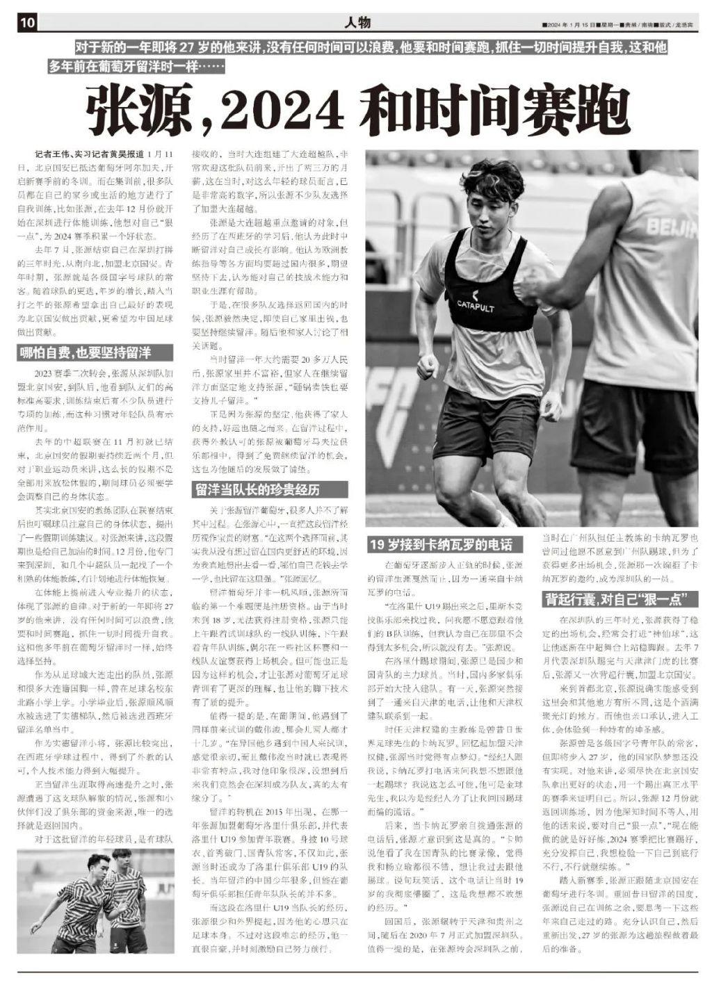 張源曾是各級國字號青年隊的常客,但即將步入27歲,他的國家隊夢想還沒有實現。對他來講,必須儘快在北京國安隊拿出更好的狀態,用一個踢出真正水平的賽季來證明自己。所以,張源12月份就返回訓練場,因爲他深知時間不等人,用他的話來說,要對自己“狠一點”,“現在能做的就是好好練,2024賽季把比賽踢好,充分發揮自己,我想檢驗一下自己到底行不行,不行就繼續練。”