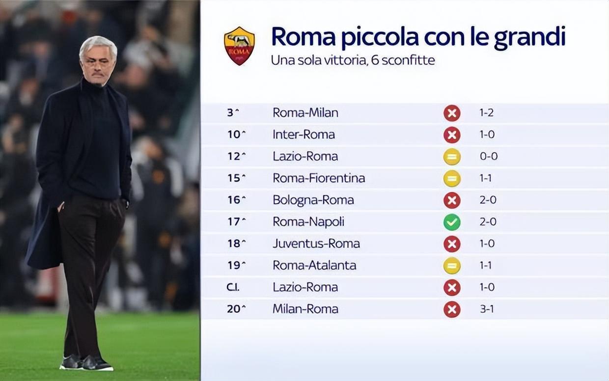 上週中意大利杯1/4決賽被同城死敵拉齊奧淘汰後,意大利《共和報》就預測,如果週末再輸米蘭,穆里尼奧就將下課。聖西羅之敗,是壓垮“狂人”的最後一根稻草,羅馬聯賽排名跌到第9位,和美國老闆弗裏德金的“歐冠底線”差5分。
