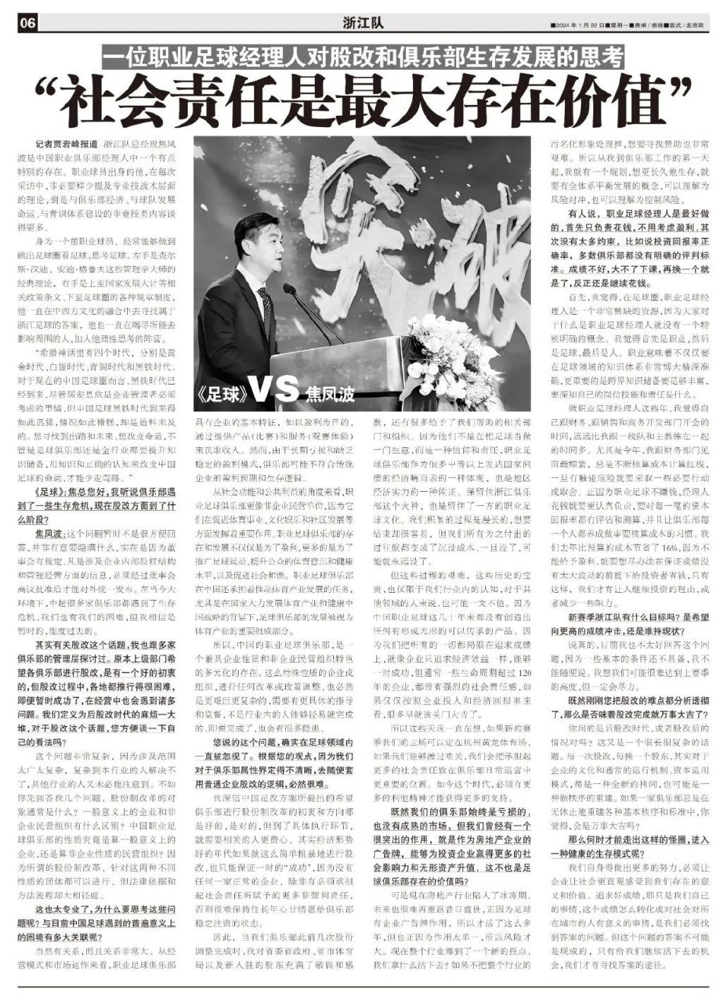 浙江職業足球俱樂部總經理焦鳳波,在中國職業俱樂部經理人中是個有點特別的存在。職業球員出身的他,在每次採訪中,非必要鮮少提及專業技戰術層面的理論,倒是與俱樂部戰略規劃運營、與球隊發展頂層設計、青訓體系架構建設等非球場競技類內容談得更多。