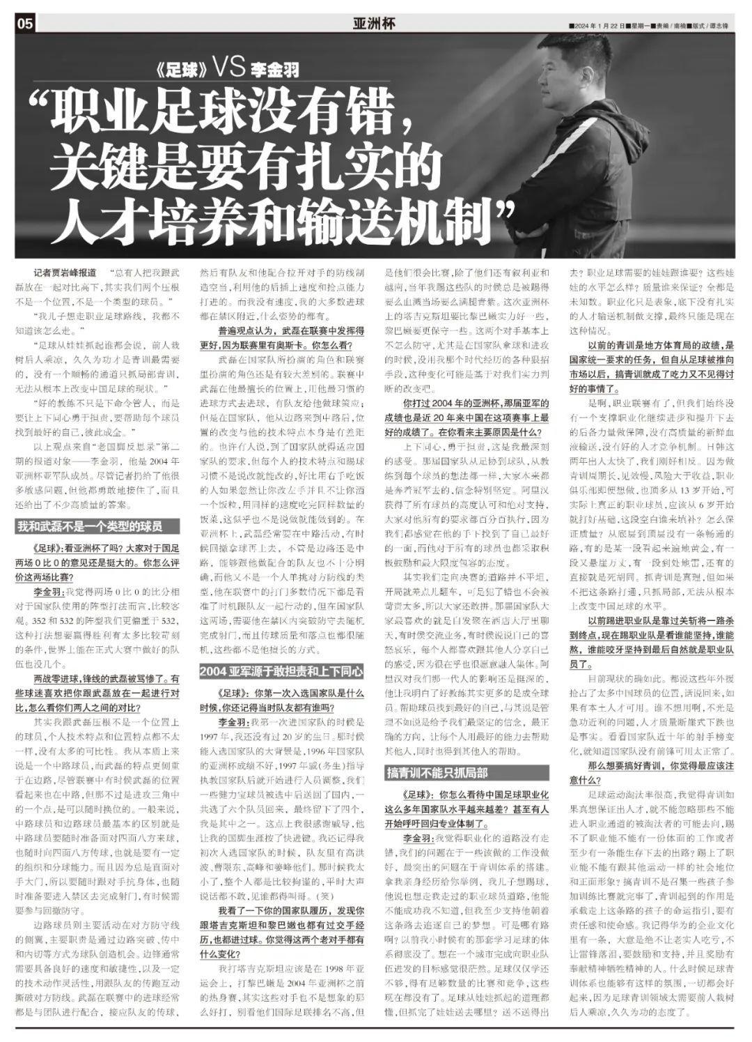 以上觀點來自“老國腳反思錄”第二期的報道對象——李金羽,他是2004年亞洲盃亞軍隊成員。亞洲盃小組賽前兩戰結束後,大羽接受了本報的專訪,儘管記者扔給了他很多敏感問題,但他都勇敢地接住了,而且還給出了不少高質量的答案。