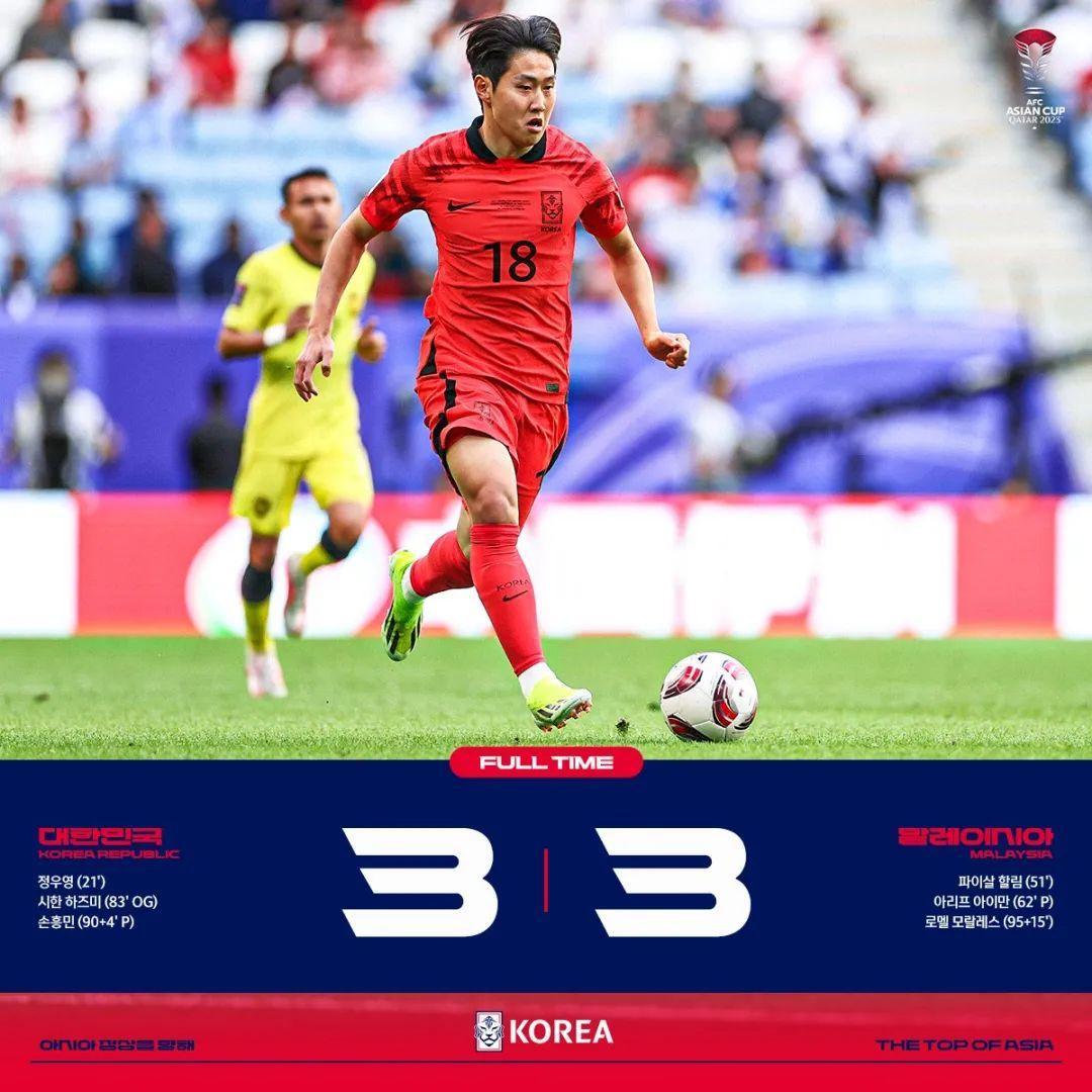 真正的“好戲”出現在補時階段:補時第2分鐘,經VAR提醒,沙特主裁判給韓國人一個點球,隊長孫興慜“頂住壓力”主罰命中,此時若比分保持到終場,韓國隊將是小組第一,1/8決賽將遭遇日本;但傷停補時進行到第15分鐘,馬來西亞在前場3對6的情況下,由哥倫比亞歸化球員莫拉萊斯在大禁區線前輕鬆推射,完成讀秒絕平。