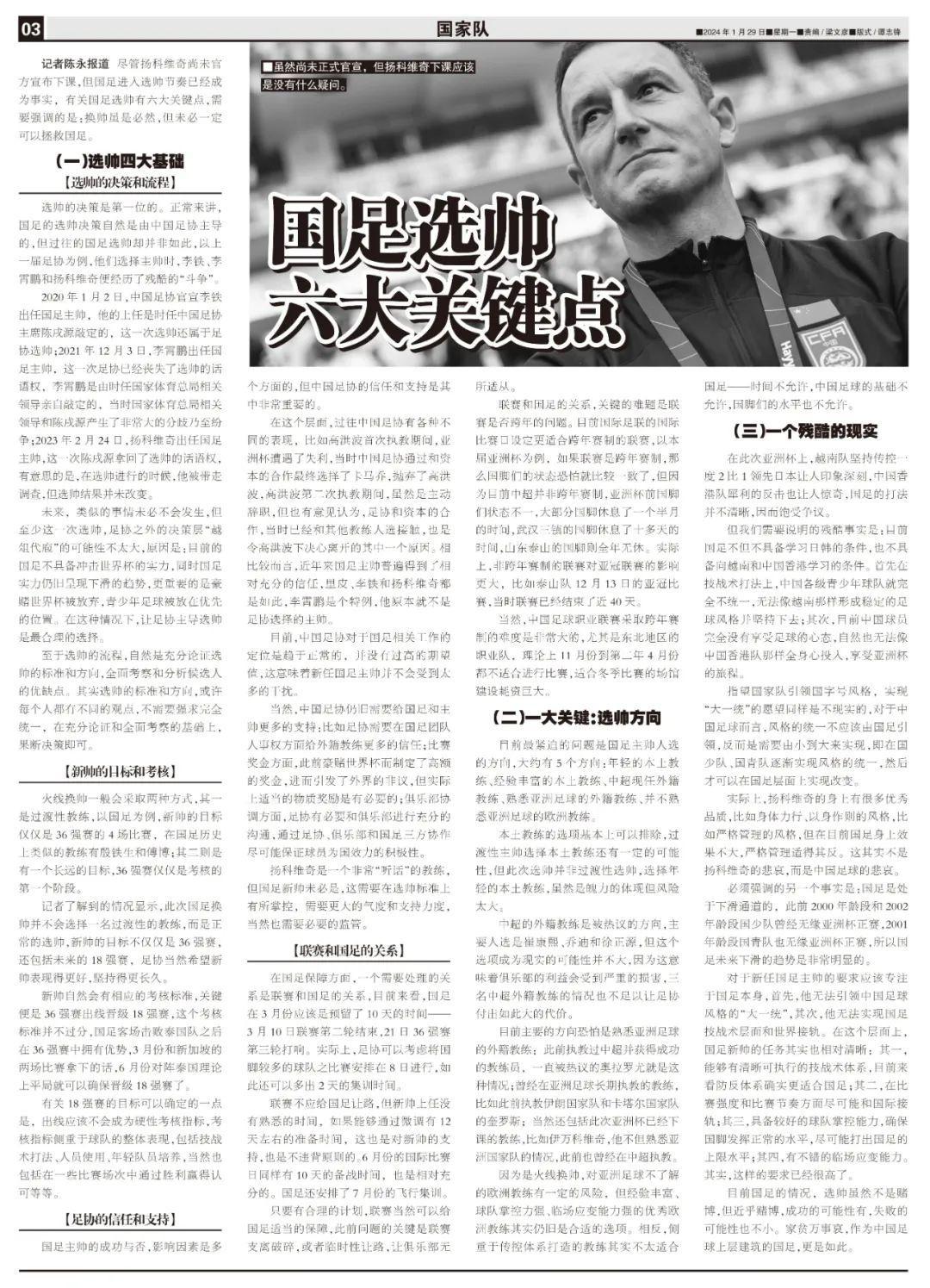 記者陳永報道 儘管揚科維奇尚未官方宣佈下課,但國足進入選帥節奏已經成爲事實,有關國足選帥有六大關鍵點,需要強調的是:換帥雖是必然,但未必一定可以拯救國足。