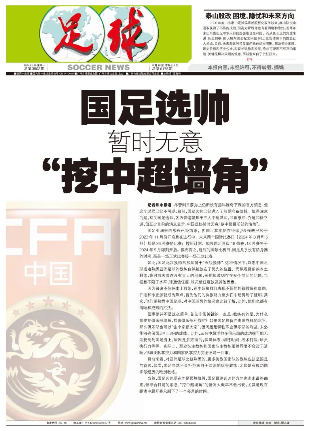 當然,國足選帥現在纔是預熱階段,國足最終選帥的方向也尚未最終確定,但綜合最新消息,“挖中超牆角”的情況大概率不會出現,尤其是現在距離中超開賽只剩下了一個多月的時間。