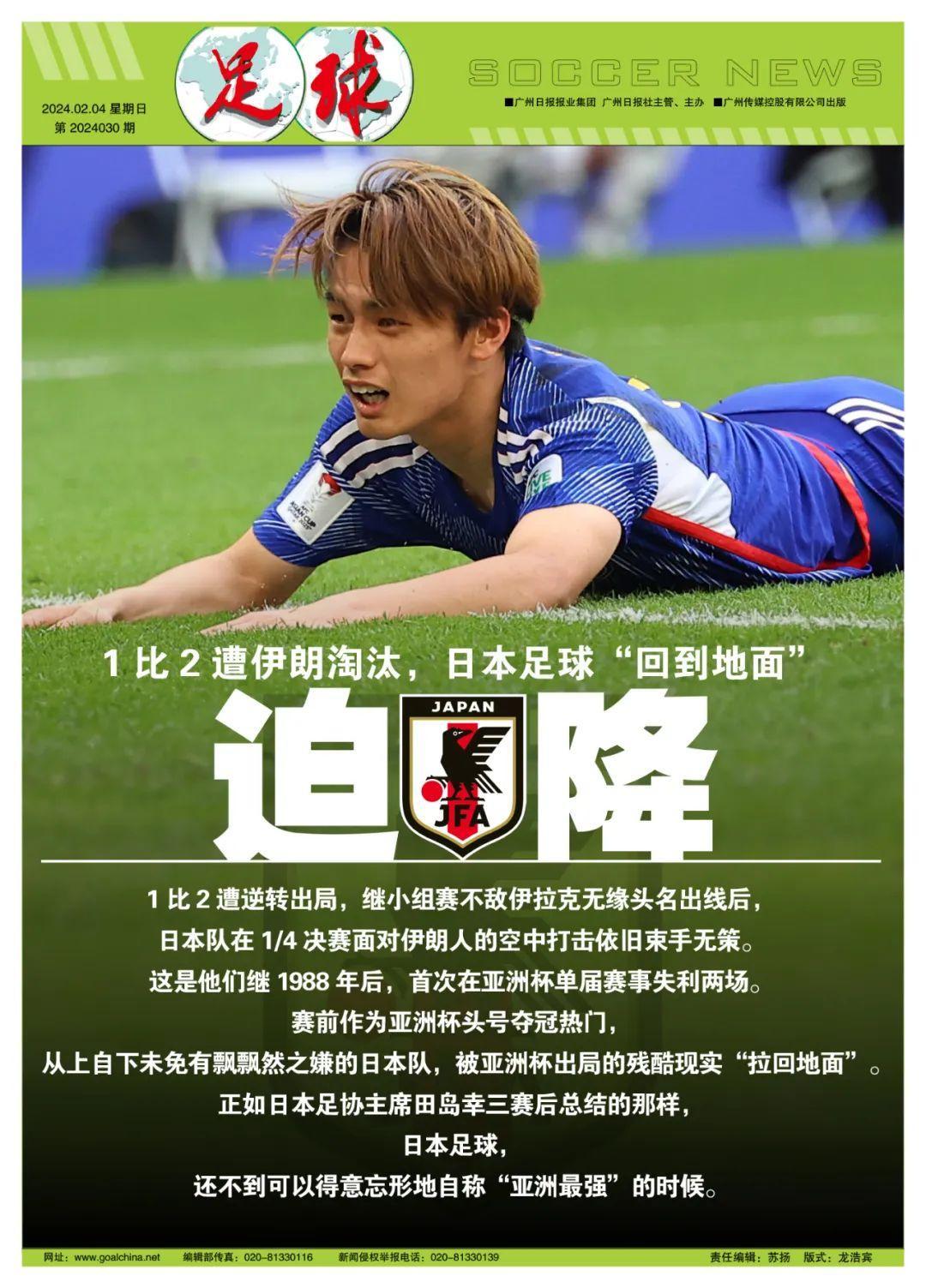 記者寒冰報道 1比2慘遭伊朗逆轉淘汰,繼小組賽不敵伊拉克無緣頭名出線後,日本隊在1/4決賽面對波斯鐵騎的空中打擊依舊束手無策。這是他們繼1988年後,首次在亞洲盃單屆賽事失利兩場。