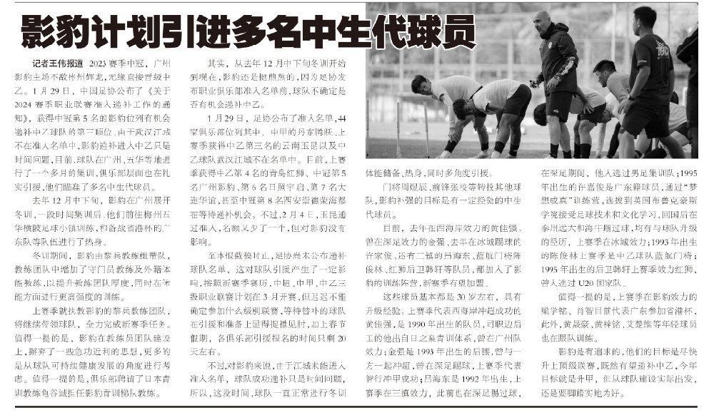 記者王偉報道 2023賽季中冠,廣州影豹主場不敵彬州輝龍,無緣直接晉級中乙。1月29日,中國足協公佈了《關於2024賽季職業聯賽准入遞補工作的通知》,獲得中冠第5名的影豹位列有機會遞補中乙球隊的第三順位,由於武漢江城不在准入名單中,影豹遞補進入中乙只是時間問題,目前,球隊在廣州、五華等地進行了一個多月的集訓,俱樂部層面也在紮實引援,他們瞄準了多名中生代球員。