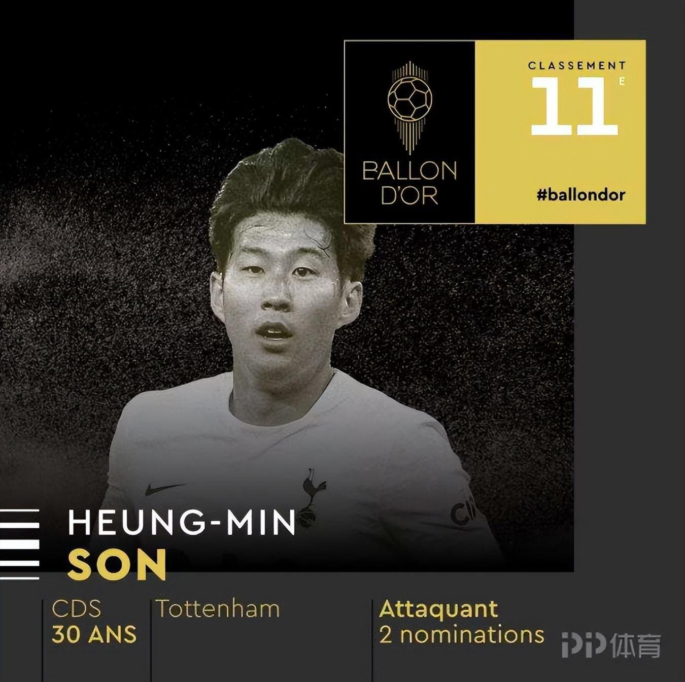 金球獎官方公佈2022年金球獎排名,效力於熱刺的韓國前鋒孫興慜位居第11。上賽季孫興慜代表熱刺出戰45場比賽,打進24球助攻10次,其中英超35場23球(0點球)9助攻,贏得英超金靴!此前孫興慜在2019年入選過一次金球獎候選名單,最終排名第22位,是亞洲球員在金球獎的歷史最高排名,今年30歲的孫興慜刷新了自己的紀錄!