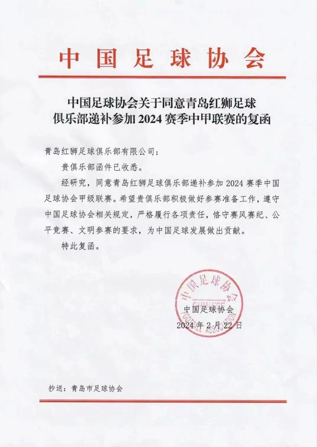 記者王偉報道 22日下午,中國足協官方發佈公告,中甲俱樂部濟南興洲退出2024賽季中甲,青島紅獅遞補,青島一城“雙超一甲”,而紅獅的中乙名額,由西安崇德榮海遞補。