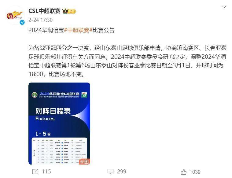 24日,中國足協發佈公告,確定山東泰山和長春亞泰的比賽提前到3月1日進行。如此,打完和長春亞泰的比賽到6日和橫濱水手的比賽有4天的間隔,考慮到泰山隊是連續主場,基本上可以不進行陣容的輪換。至於9日碰上北京國安,儘管這是重量級的比賽,對於聯賽的走勢也非常重要,但因爲13日的亞冠比賽,泰山隊恐怕不得不對陣容進行大幅度的輪換。