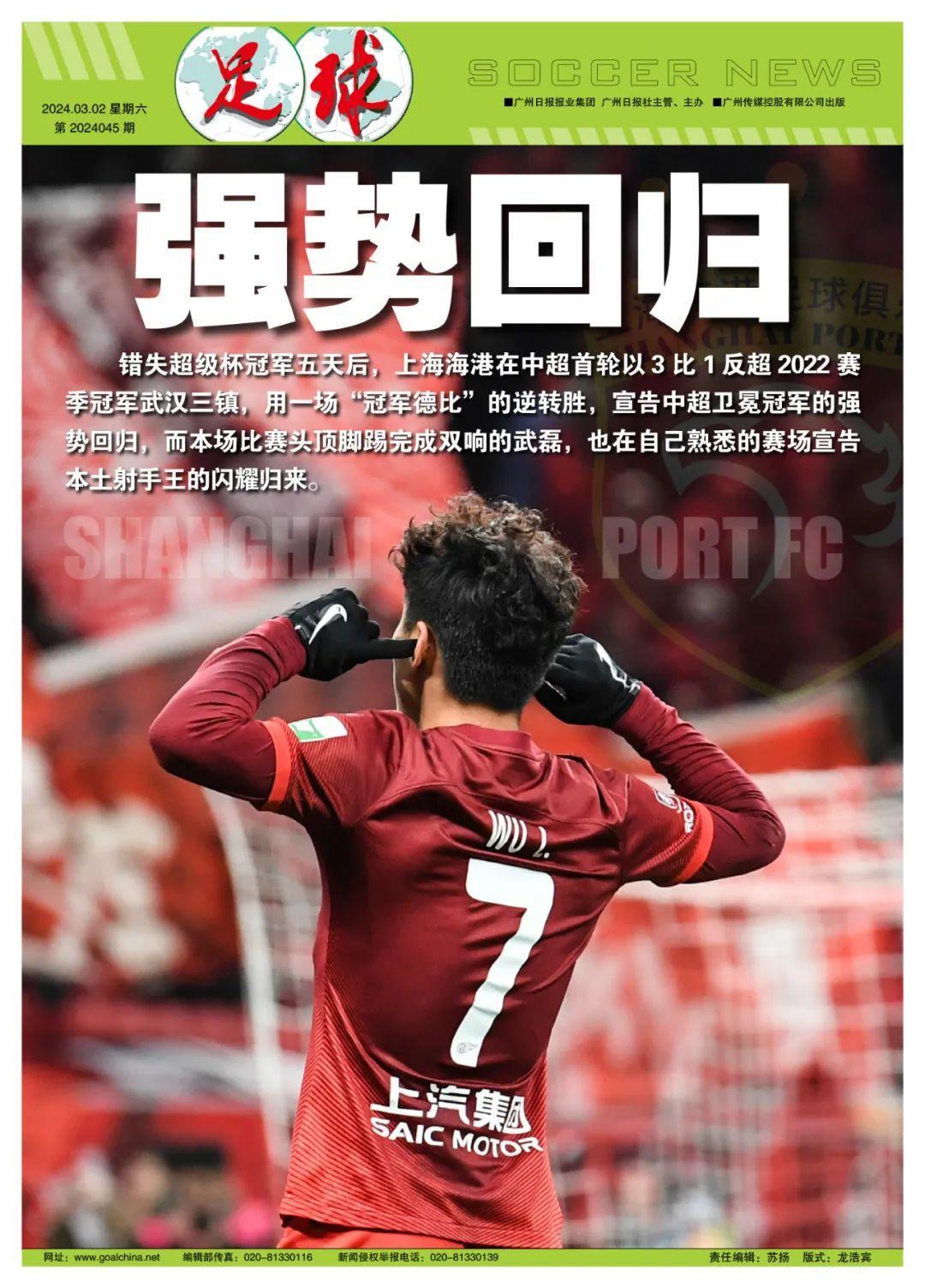 記者程善、魯蜜報道 錯失超級盃冠軍五天後,上海海港在中超首輪以3比1反超2022賽季冠軍武漢三鎮,用一場“冠軍德比”的逆轉勝,宣告中超衛冕冠軍的強勢迴歸,而本場比賽頭頂腳踢完成雙響的武磊,也在自己熟悉的賽場宣告本土射手王的閃耀歸來。