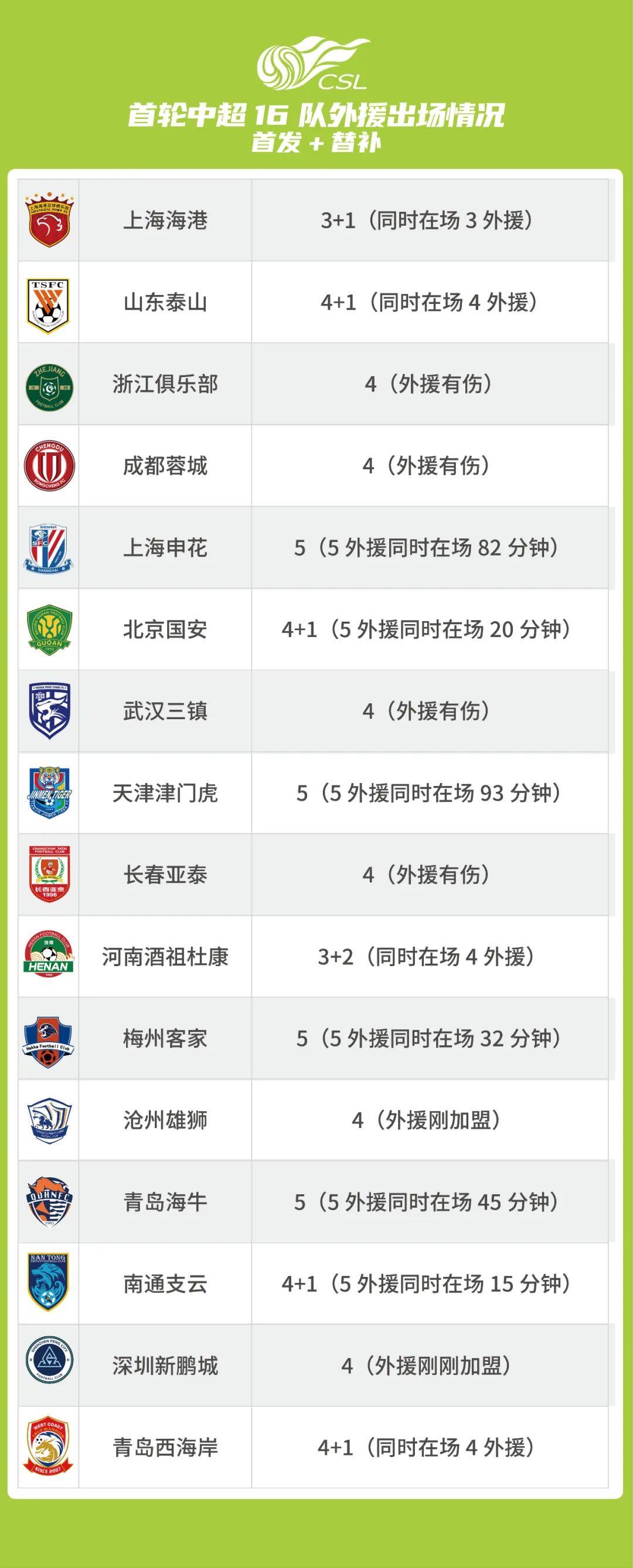 第一輪比賽後,中超16支球隊的外援出場情況如下: