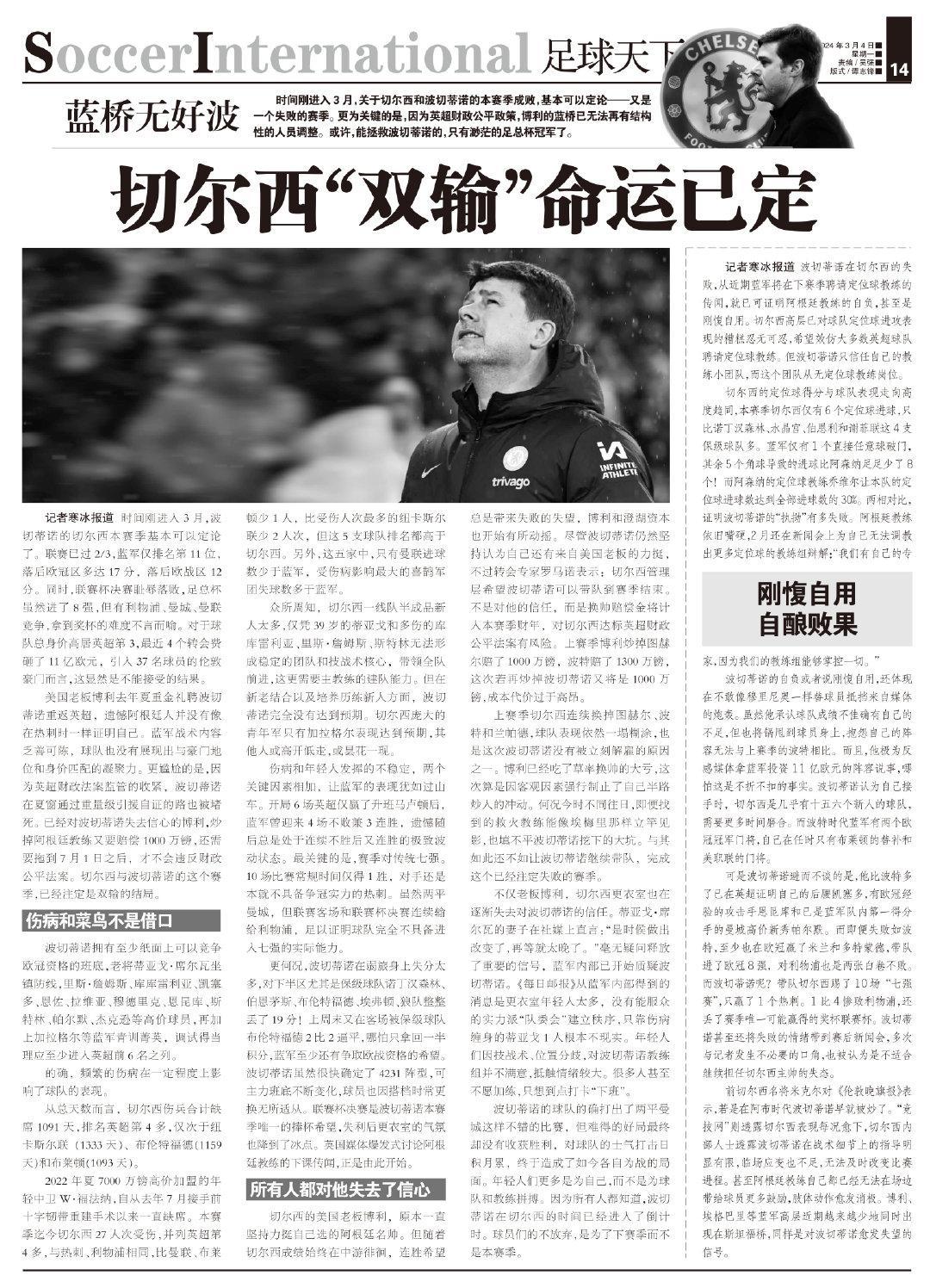 記者寒冰報道 時間剛進入3月,波切蒂諾的切爾西本賽季基本可以定論了。聯賽已過2/3,藍軍僅排名第11位,落後歐冠區多達17分,落後歐戰區12分。同時,聯賽盃決賽恥辱落敗,足總盃雖然進了8強,但有利物浦、曼城、曼聯競爭,拿到獎盃的難度不言而喻。對於球隊總身價高居英超第3,最近4個轉會費砸了11億歐元,引入37名球員的倫敦豪門而言,這顯然是不能接受的結果。