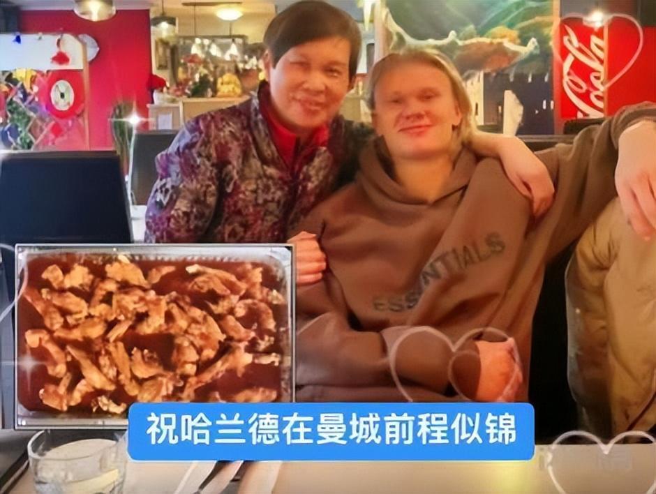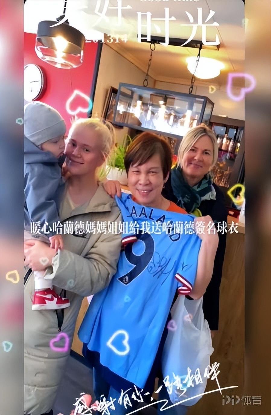 近日,哈蘭德經常光顧的中餐廳老闆娘曬照,哈蘭德媽媽和姐姐送來了哈蘭德的曼城簽名球衣。