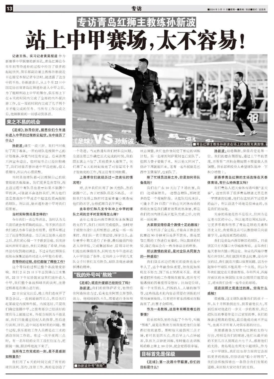 記者王偉、實習記者黃昊報道 作爲新賽季中甲聯賽的新面孔,青島紅獅在今年年初等待遞補的過程中經歷了很多的起起伏伏,俱樂部副總兼主教練孫新波近日在接受本報記者專訪時,就透露了這當中的不易。孫新波表示,從上個月22日中國足協官宣青島紅獅遞補進入中甲之後,爲了能順利站上中甲的舞臺,俱樂部上下在6天的時間內完成了全部的內外援註冊工作,在一週的時間內完成了幾乎兩個月才能完成的任務。當所有工作完成之後,他被眼前的一切感動到落淚。