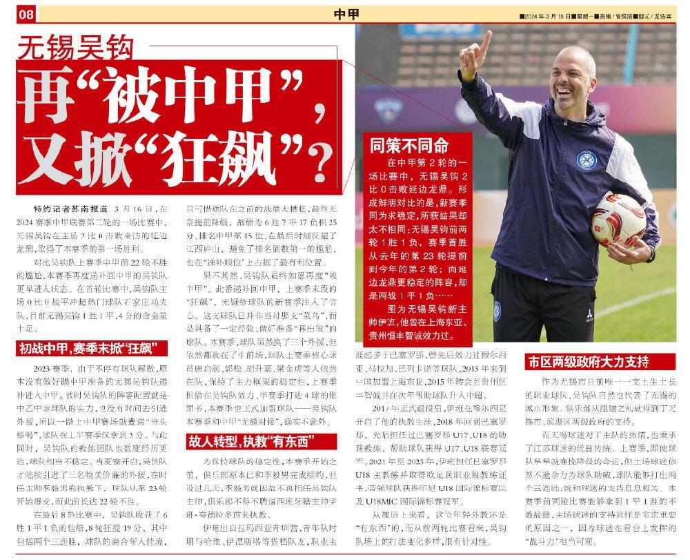 對比吳鉤隊上賽季中甲前22輪不勝的尷尬,本賽季再度遞補回中甲的吳鉤隊更早進入狀態。在首輪比賽中,吳鉤隊主場0比0戰平衝超熱門球隊石家莊功夫隊,目前無錫吳鉤1勝1平,4分的含金量十足。