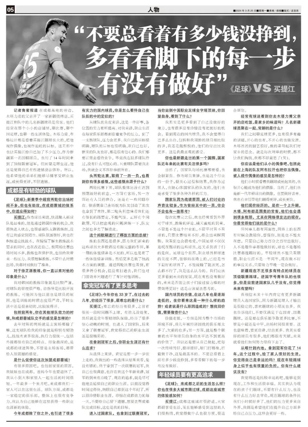 買提江:難忘的經歷有很多,之前有很長一段時間踢不上球,有勁兒沒處使,然後就是常年幫助球隊保級,經歷了很多驚心動魄的時刻。也進入了國家隊,後來又拿了聯賽冠軍,我覺得自己的職業生涯還是很精彩的。