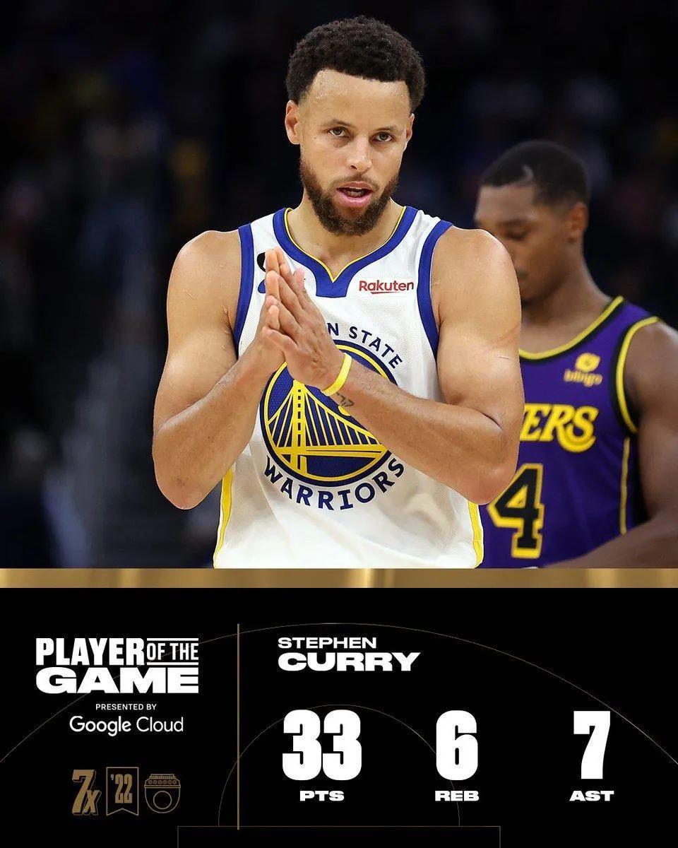 三節過後,勝負幾乎已經沒有懸念,但湖人還是盡遣主力戰鬥到最後時刻,這也成就了庫裏末節上來再拿9分,將自己的揭幕戰數據定格在33分7助攻6籃板。這是庫裏生涯至今揭幕戰個人第二高的得分,他曾在2015-16賽季揭幕戰中砍下40分。