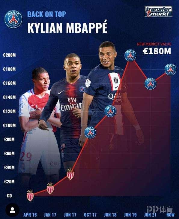 憑藉在世界盃拿到金靴獎的精彩表現,姆巴佩的身價再次大幅上升,以1.8億歐超越哈蘭德再次成爲足壇身價最高球星。德轉曬出了姆巴佩生涯身價變化曲線,在摩納哥時期最高爲3000萬歐,轉會來到巴黎之後迅速上升,並且在2019年達到巔峯的2億歐,雖然21年回落至1.6億歐,但如今再次以1.8億歐重回足壇第一。