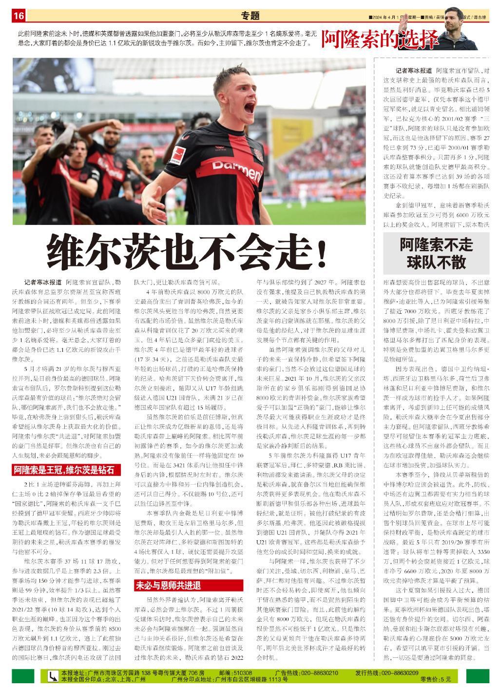 記者寒冰報道 阿隆索官宣留隊,勒沃庫森體育總監羅爾費斯甚至宣稱西班牙教練的合同還有兩年。但至少,下賽季阿隆索帶隊征戰歐冠已成定局。此前阿隆索前途未卜時,德媒和英媒都曾透露如果他加盟豪門,必將至少從勒沃庫森帶走至少1名嫡系愛將。毫無懸念,大家盯着的都會是身價已達1.1億歐元的新銳攻擊手維爾茨。