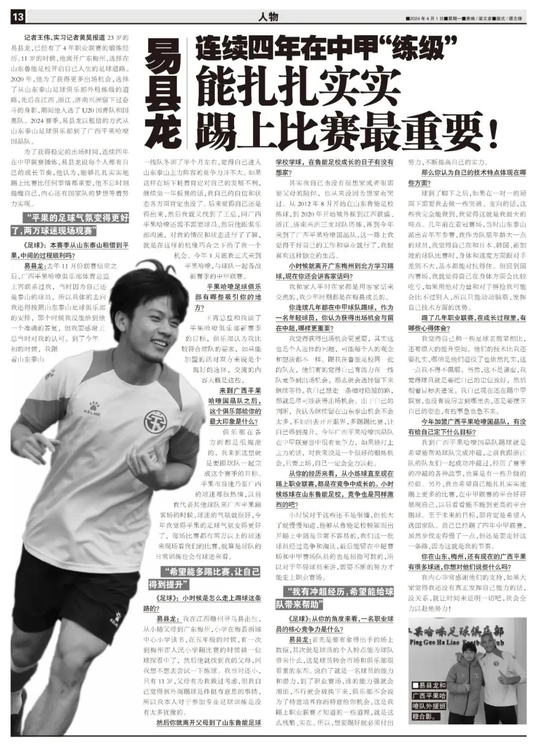 易縣龍:去年11月份聯賽結束之後,廣西平果哈嘹俱樂部體育總監王霄聯繫過我,當時因爲自己還是泰山的球員,所以具體的去向我還得按照山東泰山足球俱樂部的安排,那個時候我沒能給到他一個準確的答覆,但我要感謝王總當時對我的認可。到了今年初的時候,我跟着山東泰山一線隊冬訓了半個月左右,覺得自己進入山東泰山主力陣容的競爭力並不大。如果這樣在場下耗着肯定對自己的發展不利,繼續坐一年板凳的話,我自己的自信和狀態各方面肯定也沒了。