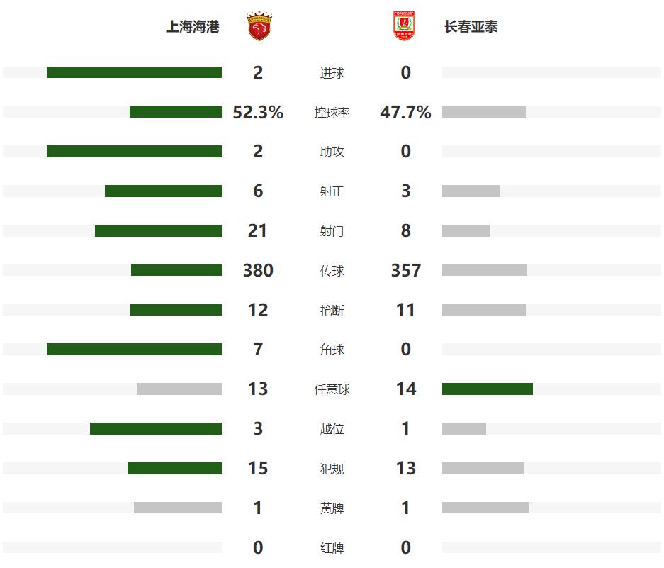 全場結束,最終上海海港主場2-0擊敗長春亞泰。