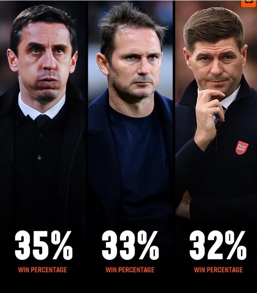以前,大家都在吐槽內維爾的執教水平,只因他在瓦倫西亞那一段短暫的執教經歷。但事實上,他在瓦倫西亞執教時勝率也有35%,要比蘭帕德在埃弗頓(33%)和傑拉德在維拉(32%)的執教勝率還要高。