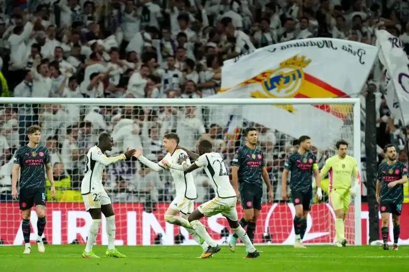 開場2分鐘起比分和形勢就不斷交錯變化。作客的曼城兩度領先,但皇馬又兩度扳平比分。6個進球、半數堪稱世界波的神仙球對轟讓球迷大飽眼福:第14分鐘羅德里戈一路途徑禁區,面對夾擊的阿坎吉和迪亞斯,冷靜推射入網;下半場福登在禁區弧轟出遠射世界波直掛死角,5分鐘後前插的中衛格瓦迪奧爾又在禁區外轟出世界波死角遠射,這還是他加盟曼城後的處子球;皇馬隨後的扳平球也非常精彩,巴爾韋德接維尼修斯傳中直接凌空抽射得手。
