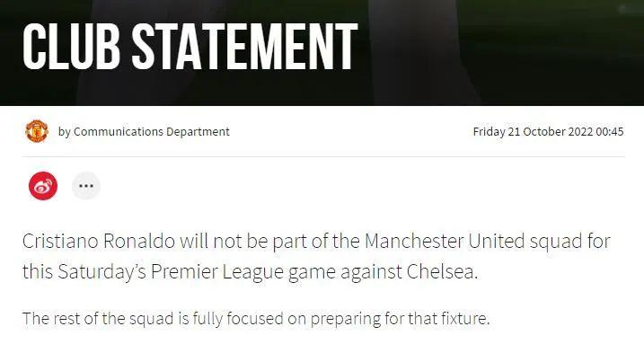 賽後面對採訪鏡頭略顯尷尬的滕哈赫,沒有違背自己“明天再處理”的承諾,比賽次日,曼聯官方宣佈,C羅將不會隨隊客戰切爾西,隨後多家媒體證實C羅未來三天也將單獨訓練——實際上則是被剝奪了合練資格。