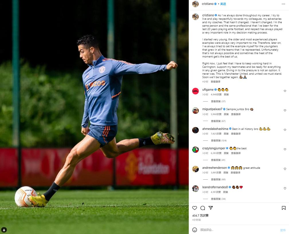 C羅也在社交媒體發表回應聲明,提及這次提前離場,算是含蓄致歉,表態“頭腦發熱會讓我們失去最好的自己”,但全文更強調“尊重”二字:“正如我在整個職業生涯中一直所做的,我努力尊重隊友、對手和教練,這並未改變。我沒有改變,和20年來我開始參加職業比賽時一樣,‘尊重’一詞,在我的決策過程中始終發揮這非常重要的作用。”可謂一語雙關。