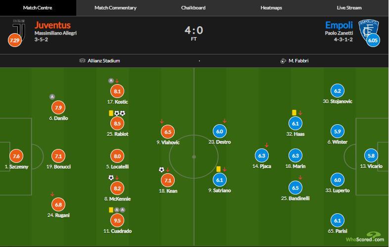 第94分鐘,達尼洛助攻拉比奧特完成梅開二度,尤文把比分鎖定爲4-0。