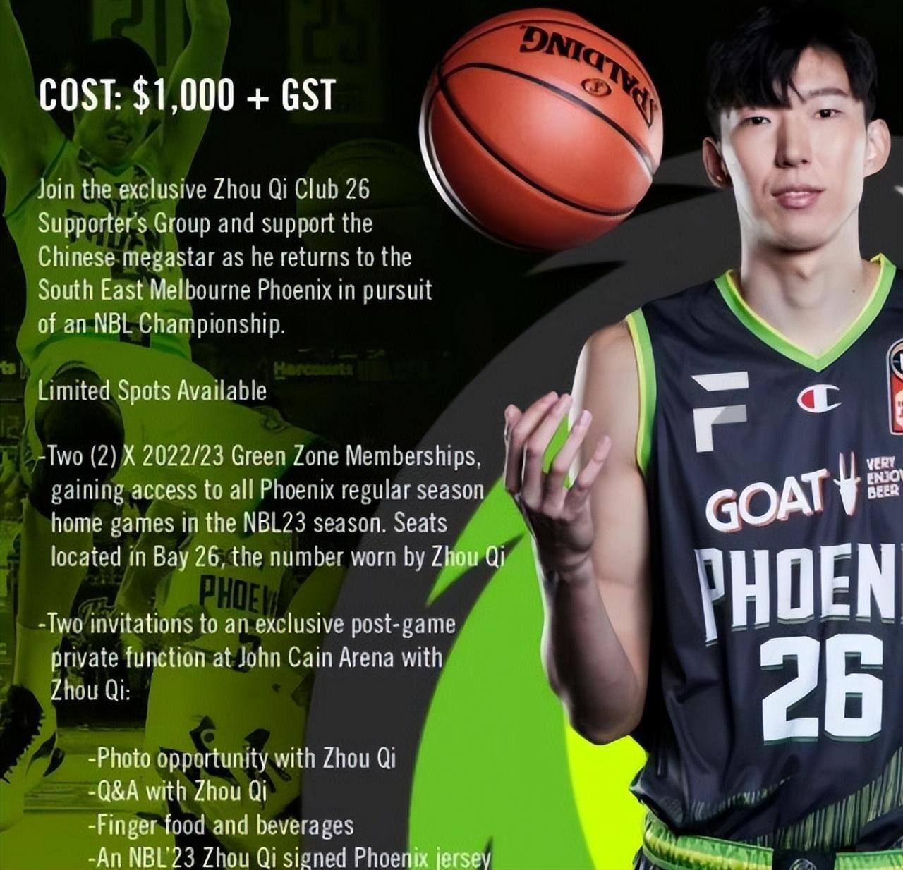 據媒體人“半神半卡特”報道,NBL鳳凰隊開通了周琦專屬後援團。據悉,後援團權益包括兩張主場26區的季票、賽場小喫飲料,與周琦合影、問答的機會以及簽名球衣,售價1000澳幣,約合人民幣4550元。