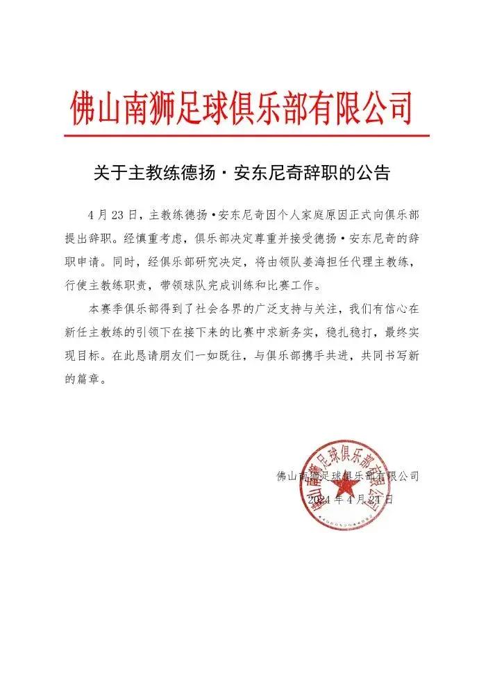 24日下午,佛山南獅官方發佈公告稱,安東尼奇因個人家庭原因提出辭職,俱樂部接受申請。同時,球隊領隊姜海將擔任代理主教練,行使主教練職責,帶領球隊完成訓練和比賽工作。