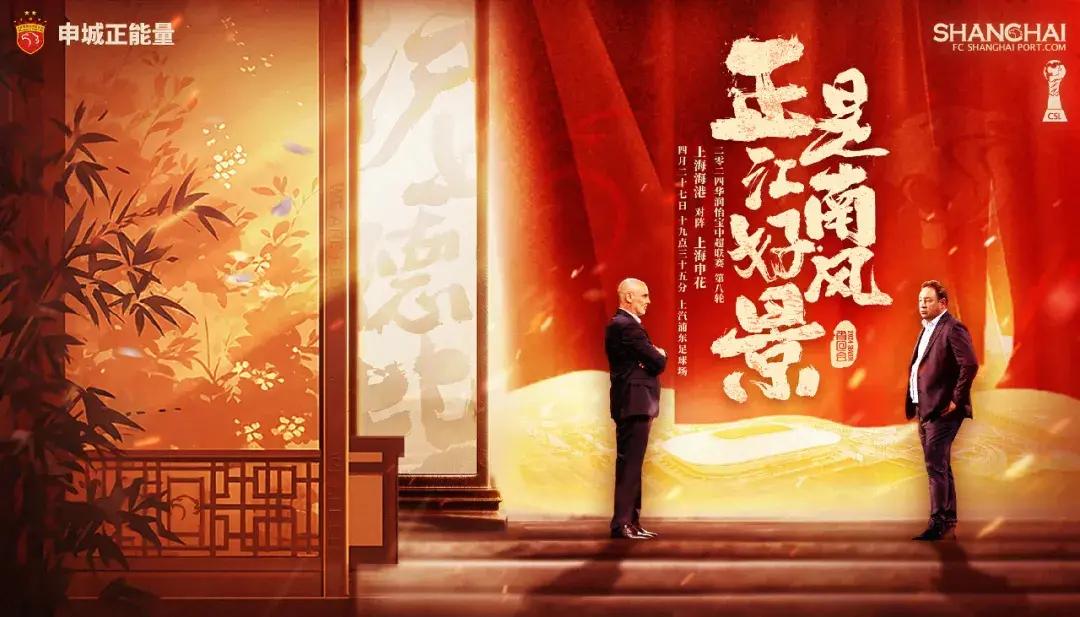 賽前,海港的出征海報印上了“正是江南好風景”,配上兩位主帥的小圖,相比較於此前幾個賽季霸氣外露的口號,這幅海報看起來是風輕雲淡、歲月靜好的樣子。但實際上,這段詩詞的後一句是“落花時節又逢君”,或許這樣的解讀才真正詮釋了海港在賽前對於本場德比的態度。