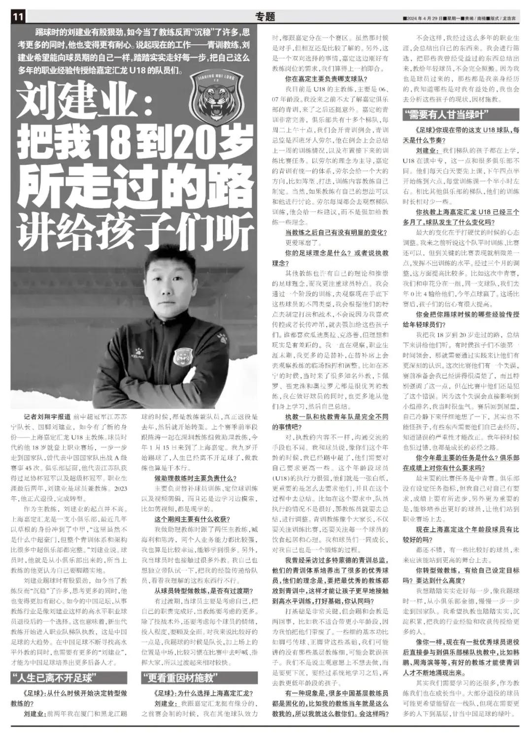 記者劉翔宇報道 前中超冠軍江蘇蘇寧隊長、國腳劉建業,如今有了新的身份——上海嘉定匯龍U18主教練。球員時代的他18歲就登上職業賽場,一步一步走到國家隊,曾代表中國國家隊出戰A級賽事45次。俱樂部層面,他代表江蘇隊獲得過足協盃冠軍以及超級盃冠軍。職業生涯最後兩年,劉建業是球員兼教練。2023年,他正式退役,完成轉型。