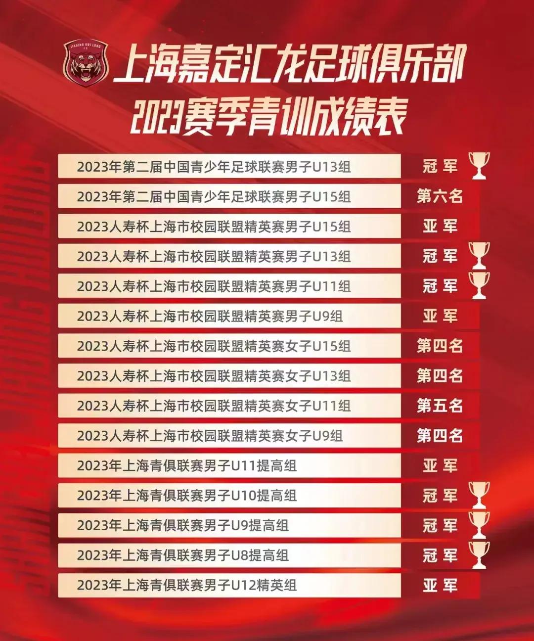 在嘉定匯龍開始發展青訓培訓前,嘉定區足球別說在全國,在上海都屬於末遊。但隨着匯龍青訓體系的搭建,日積月累走進校園,嘉定區青少年足球已經躋身上海乃至全國前列。2023年一年,嘉定區獲得了上海市級賽不同年齡段的6個冠軍和3個亞軍。中青賽U15年齡組,他們獲得了全國第六,而在U13年齡段他們則是全國冠軍。上海嘉定一支中甲小俱樂部能夠在山東泰山的壟斷中殺出重圍,實屬不易。