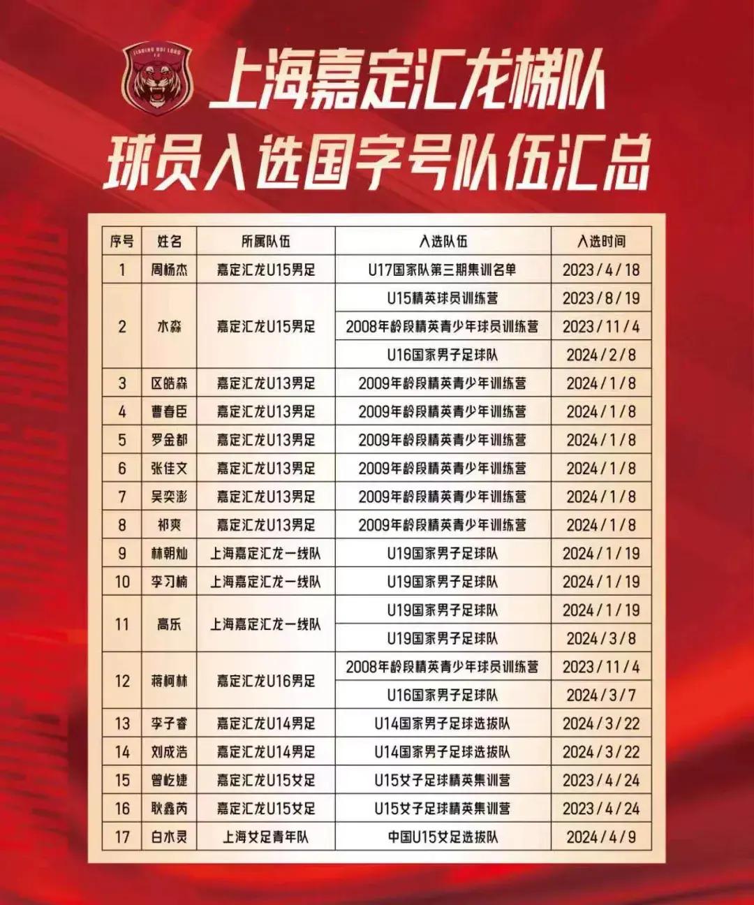 除了成績之外,人才輸送是職業俱樂部做精英青訓的最終目的,嘉定在這方面成材率極高。國青、國少各年齡段隊伍都有嘉定的球員進入海選名單。U18球隊的中後衛高樂,上個賽季就在中甲有過出場,前不久又入選國青並有出場記錄,算是其中的佼佼者。