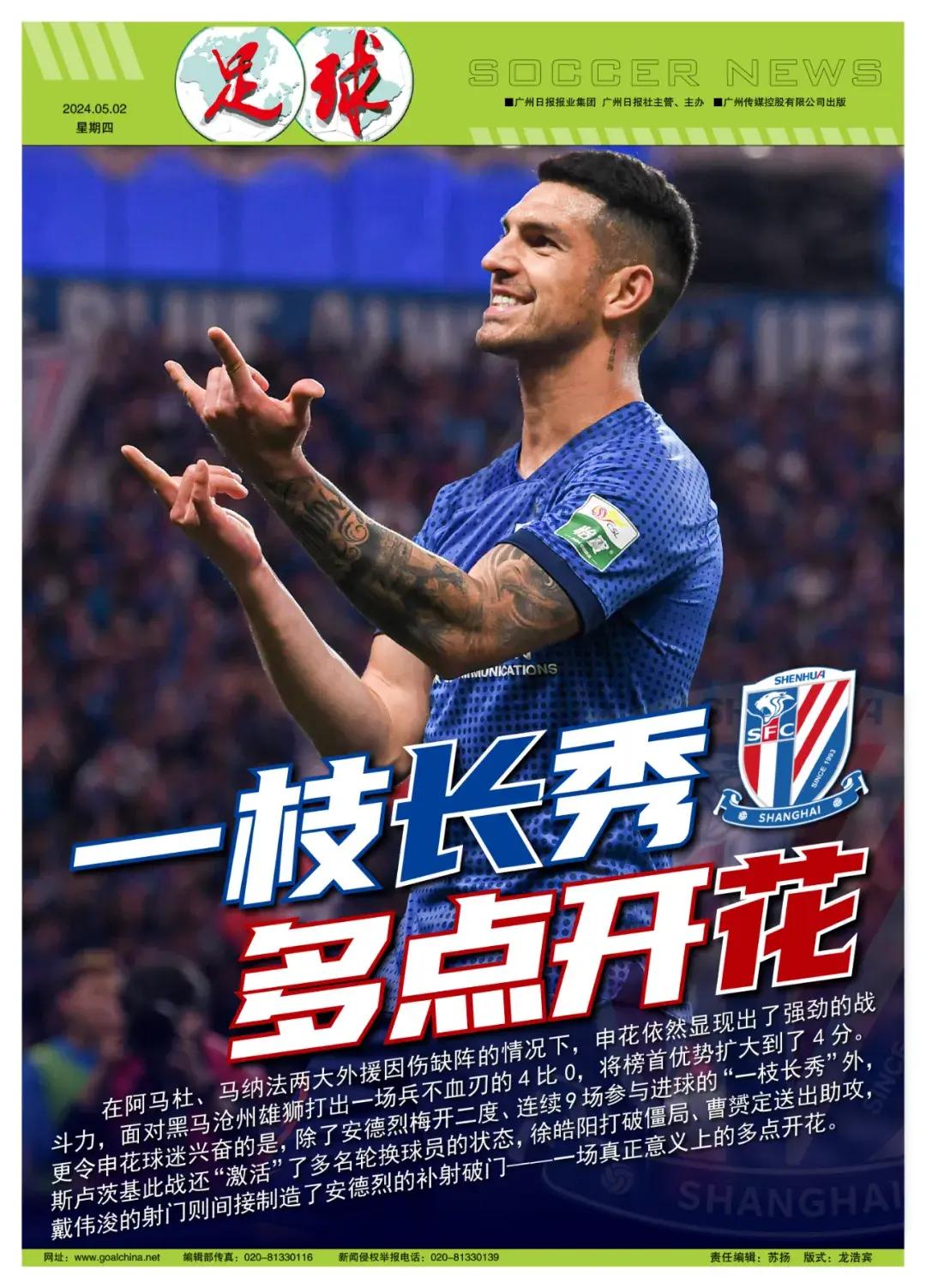 更令申花球迷興奮的是,除了安德烈梅開二度、連續9場參與進球的“一枝長秀”外,斯盧茨基此戰還“激活”了多名輪換球員的狀態,徐皓陽首開記錄、曹贇定送出助攻,戴偉浚的射門則間接製造了安德烈的補射破門——一場真正意義上的多點開花。