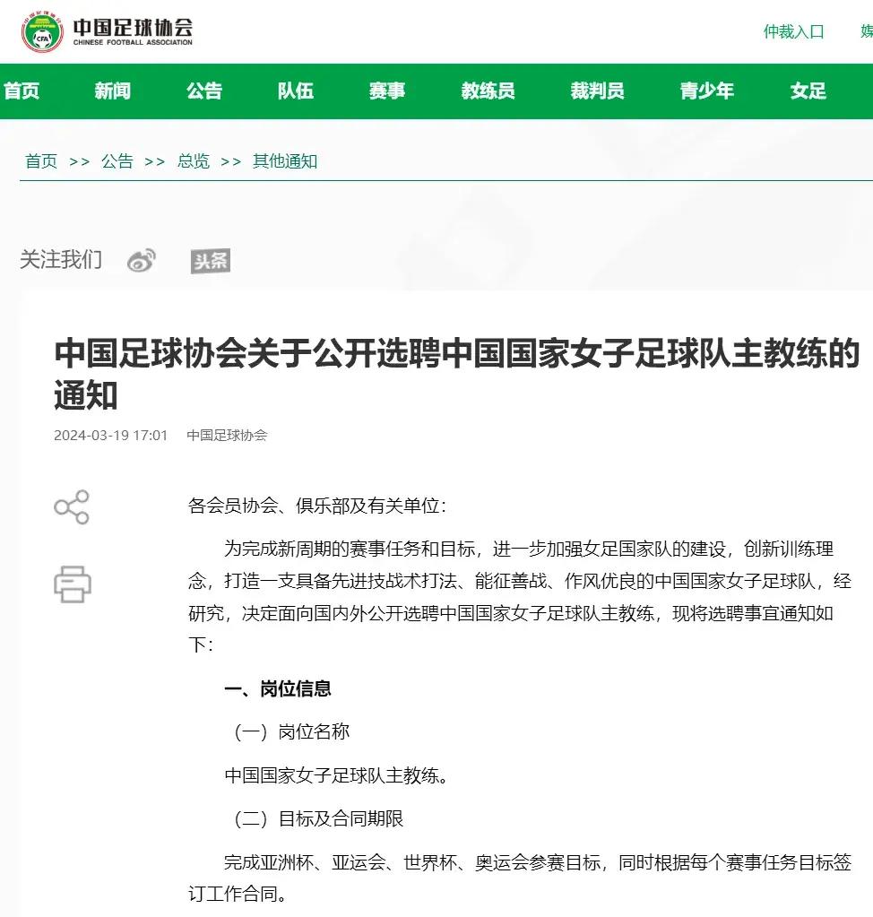 中國足協在3月19日發佈了女足國家隊主教練的選聘公告,並要求14天內完成報名,隨後4月中旬開始進行線上面試,爲此足協專門成立評審專家小組對報名參加選聘的教練員進行篩選。
