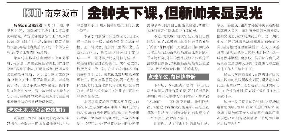第6輪主場被佛山南獅0比0逼平後,南京城市原主教練金鐘夫已因“身體原因”離開了球隊,原助理教練、巴西人法比奧接任4輪後,僅2比1贏了江西廬山,2比2、1比1平了蘇州東吳、無錫吳鉤,本輪1比2不敵重慶銅梁龍。新帥率隊4輪拿到5分,原主帥金鐘夫6輪拿8分,由此看換帥的效果差強人意,但前兩季衝超強隊的氣質已難覓影蹤。