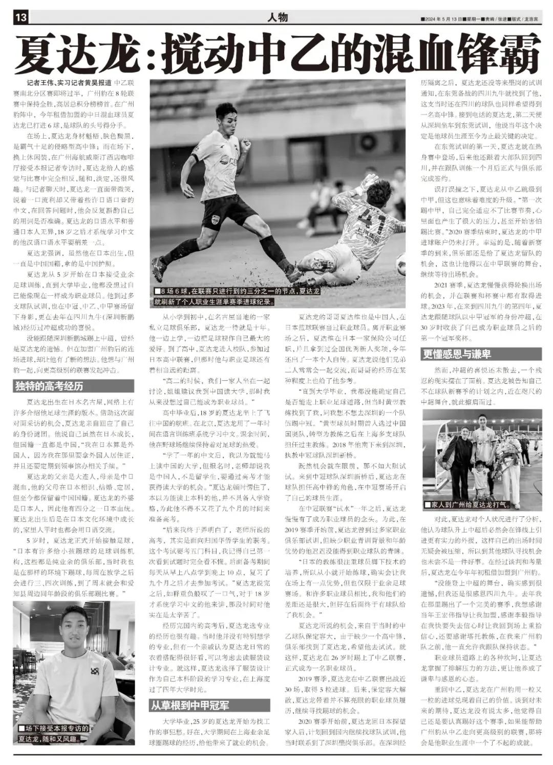記者王偉、實習記者黃昊報道 中乙聯賽南北分區賽即將過半,廣州豹在8輪聯賽中保持全勝,高居總積分榜榜首。在廣州豹陣中,今年租借加盟的中日混血球員夏達龍已打進6球,是球隊的頭號得分手。