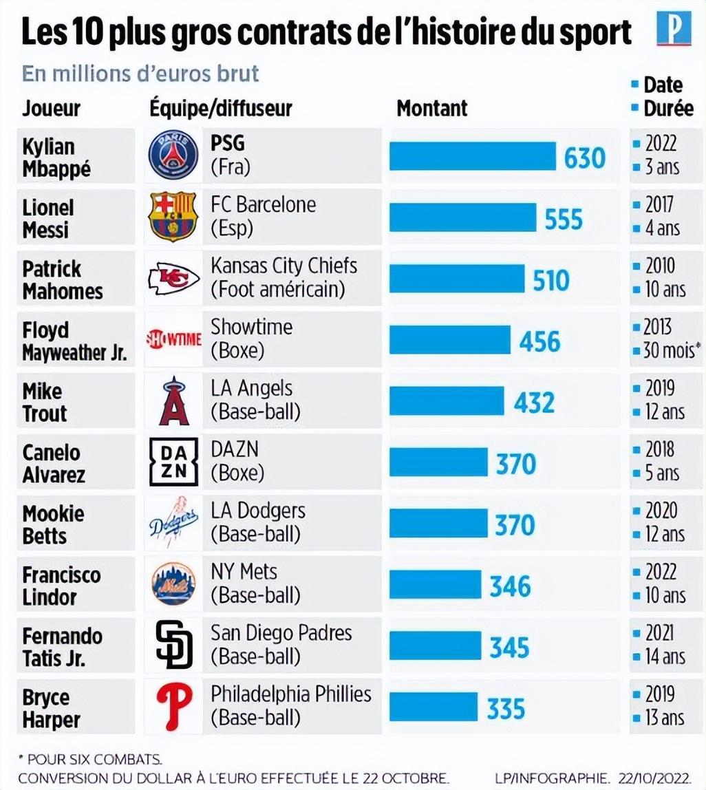 《巴黎人報》稱,如果姆巴佩激活最後一年的續約條款,大巴黎在未來三年將會爲姆巴佩支付6.3億的工資和獎金,其中2.82億歐元將會進入姆巴佩自己的口袋。此前,體育界最大的合同是梅西在2017年跟巴薩簽下的4年5.55億歐元。