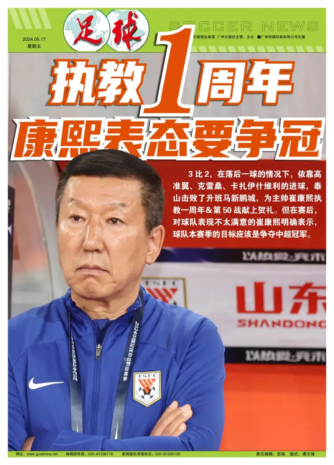 記者陳永報道 3比2,在落後一球的情況下,依靠高準翼、克雷桑、卡扎伊什維利的進球,泰山擊敗了升班馬新鵬城,爲主帥崔康熙執教一週年&第50戰獻上賀禮。但在賽後,對球隊表現不太滿意的崔康熙明確表示,球隊本賽季的目標應該是爭奪中超冠軍。