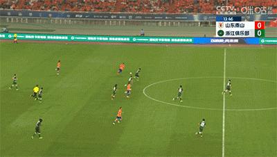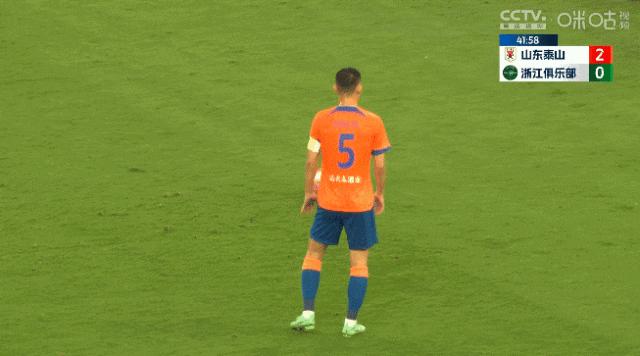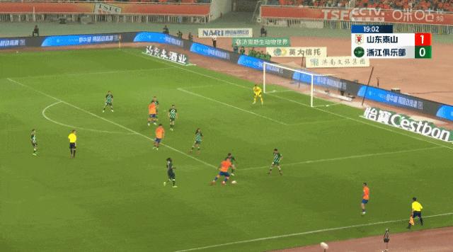 隨後,隊長鄭錚在比賽第42分鐘直接任意球破門,幫助泰山隊打進第三個進球。這個直接任意球角度刁鑽,擦立柱入網,趙博奮力撲救甚至直接撞在門柱上都無法阻止皮球入網。