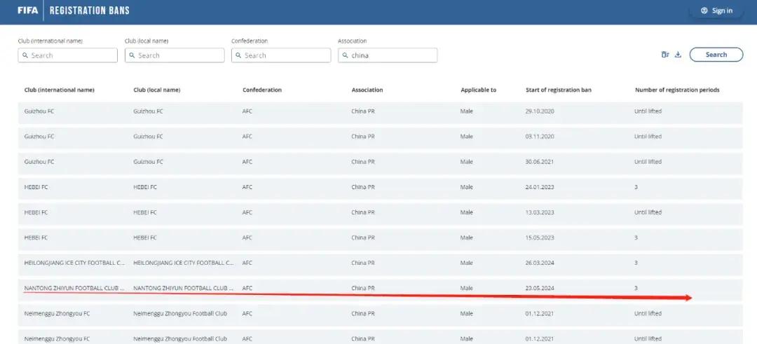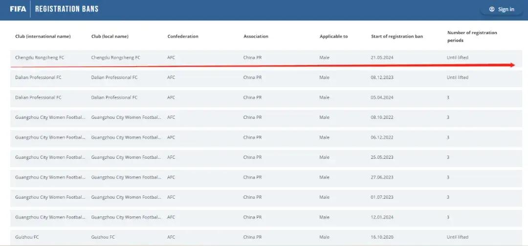 國際足聯註冊禁令網站的數據中新增了兩家中超俱樂部,成都蓉城從2024年5月21日起被處以無限期的註冊禁令,南通支雲則從2024年5月23日起被處以3個轉會窗的註冊禁令。在禁令期間,成都蓉城與南通支雲將無法註冊新球員,國際足聯目前並沒有就兩傢俱樂部遭遇禁令的理由做出說明。