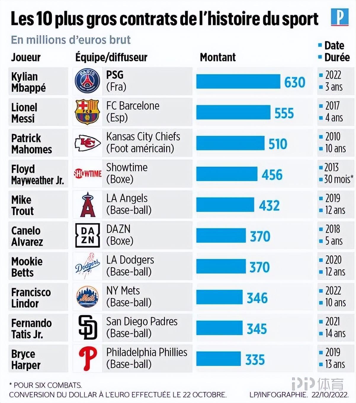 該報盤點了體育史上金額前十的合同,姆巴佩以3年總額6.3億歐排名第一,梅西2017年簽下的4年合同總額5.55億歐排名第二。