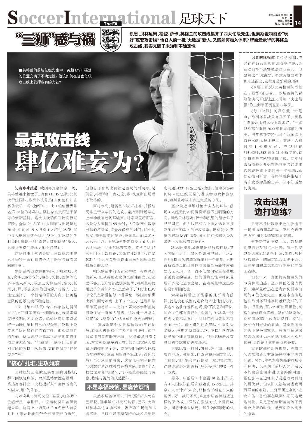 正式比賽開打時,凱恩、薩卡加上偏進攻的中場貝林厄姆,這或許將是固定組合,而福登,很可能會先行偏安於左邊鋒位置,這也許就是索斯蓋特“肆億妄爲”的唯一打開方式。