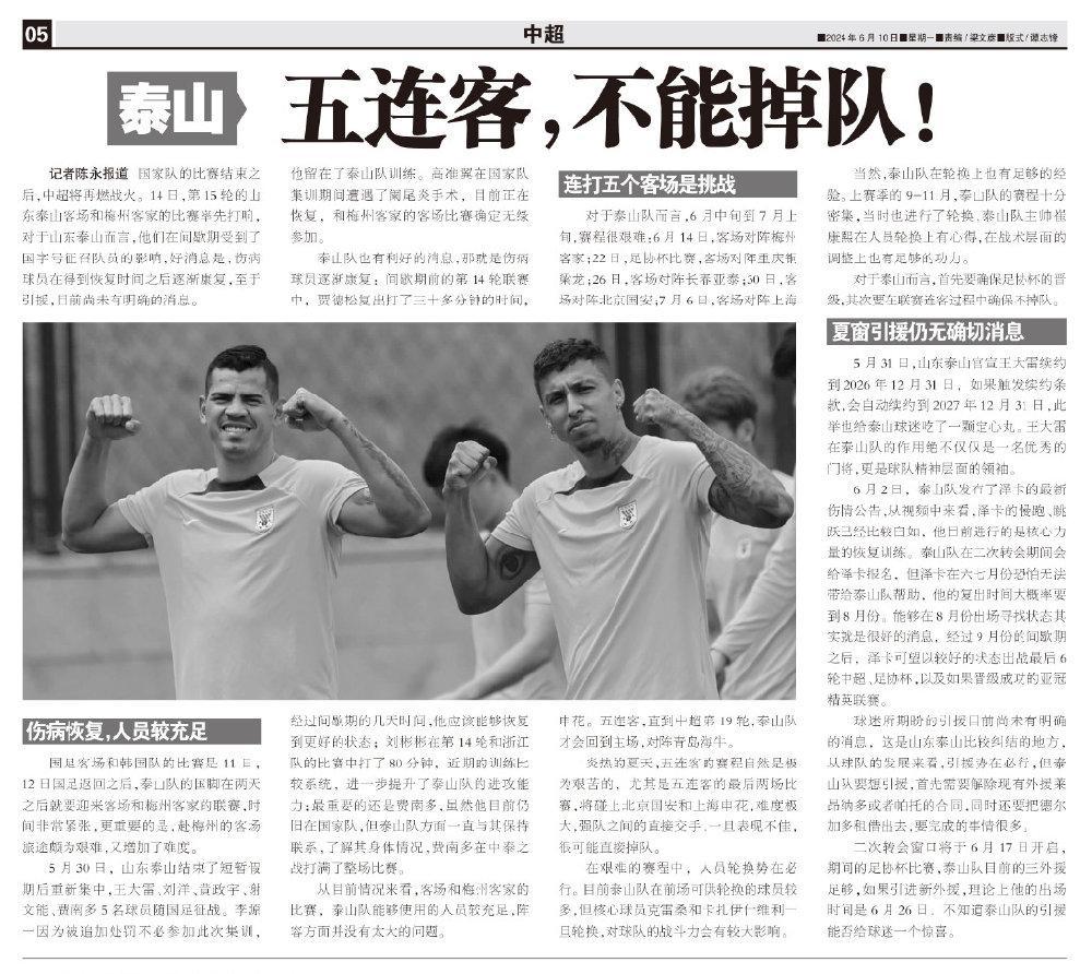 對於泰山隊而言,6月中旬到7月上旬,賽程很艱難:6月14日,客場對陣梅州客家;22日,足協盃比賽,客場對陣重慶銅梁龍;26日,客場對陣長春亞泰;30日,客場對陣北京國安;7月6日,客場對陣上海申花。五連客,直到中超第19輪,泰山隊纔會回到主場,對陣青島海牛。