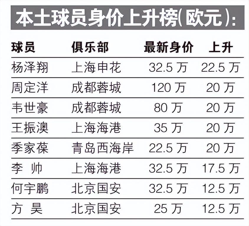 出色的球員對於俱樂部的成績有很大幫助,當然,好的平臺也有利於球員自身的提升。本賽季身價提升較顯著的本土球員,大多來自於上海兩支球隊以及成都蓉城、北京國安等強隊,申花、海港、蓉城以及國安,正是目前中超積分榜前四位球隊。