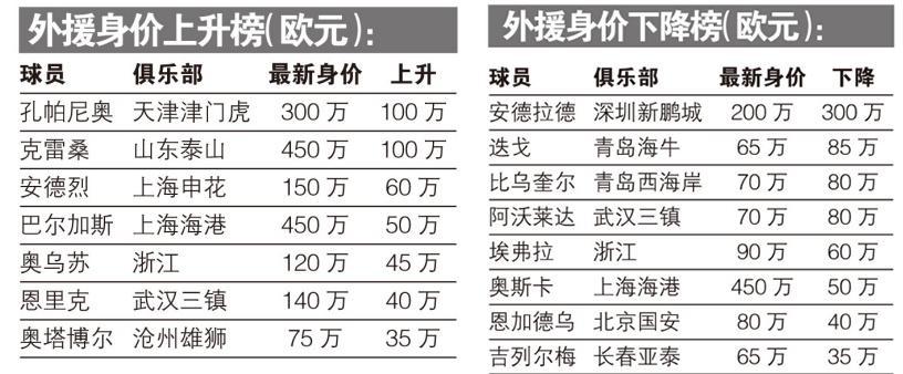 孔帕尼奧、克雷桑等外援狀態爆棚,身價水漲船高。不過,中超身價下跌的外援仍然超過半數,關鍵原因還是球員表現糟糕。