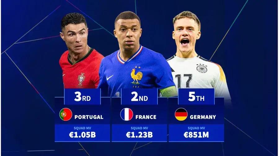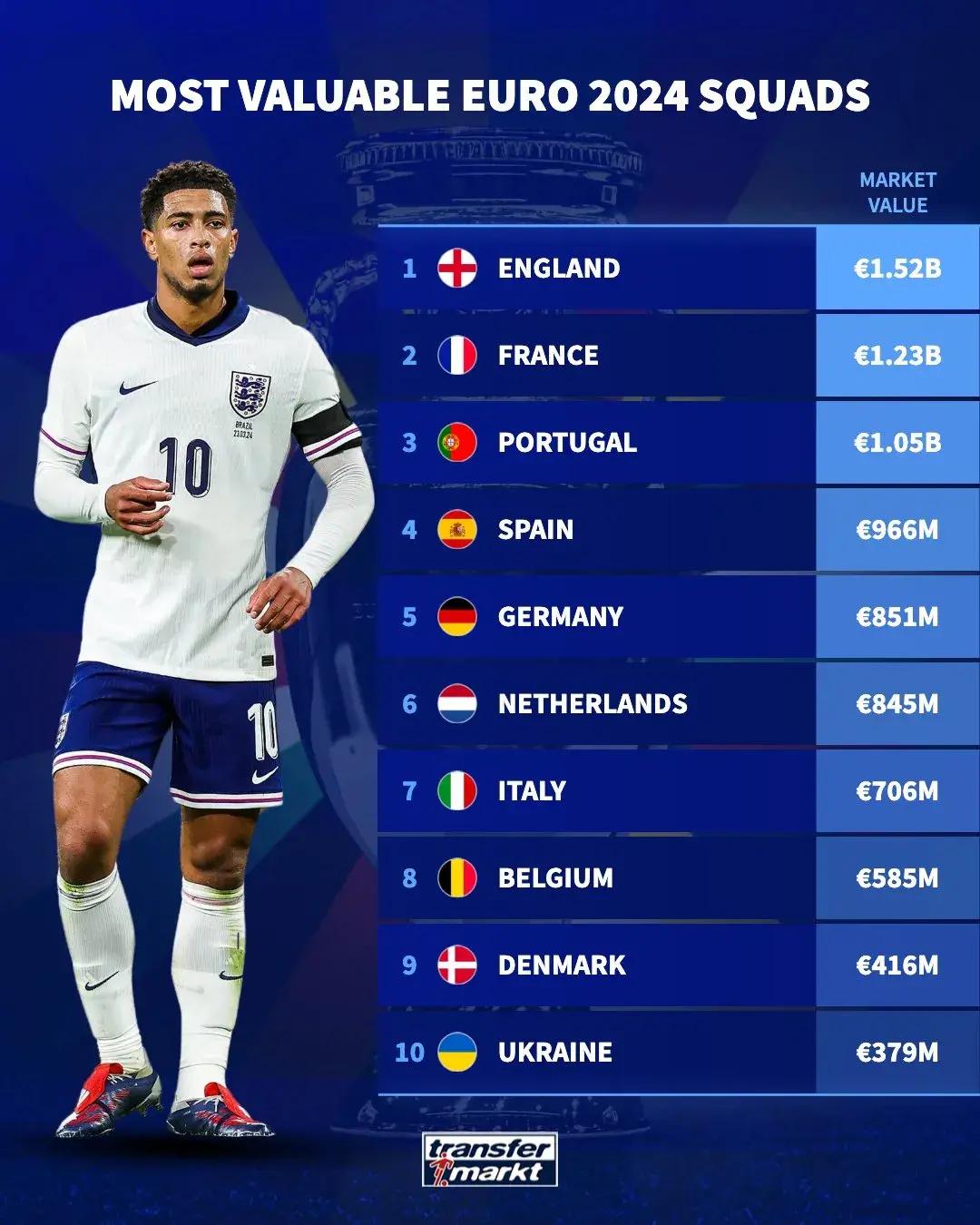 3年前的英格蘭隊(12.7億)與法國隊(10.3億),是歐洲盃首次有總身價突破10億歐元大關的參賽隊。今年歐洲盃“10億歐元隊”增加到3支,英格蘭(15.15億)繼續領跑,法國(12.34億)緊隨其後,葡萄牙(10.45億)排名第3位。若非歐洲金童獎得主加維(9000萬)重傷缺席,西班牙(9.66億)將會成爲歐洲盃第4支“10億歐元隊”。